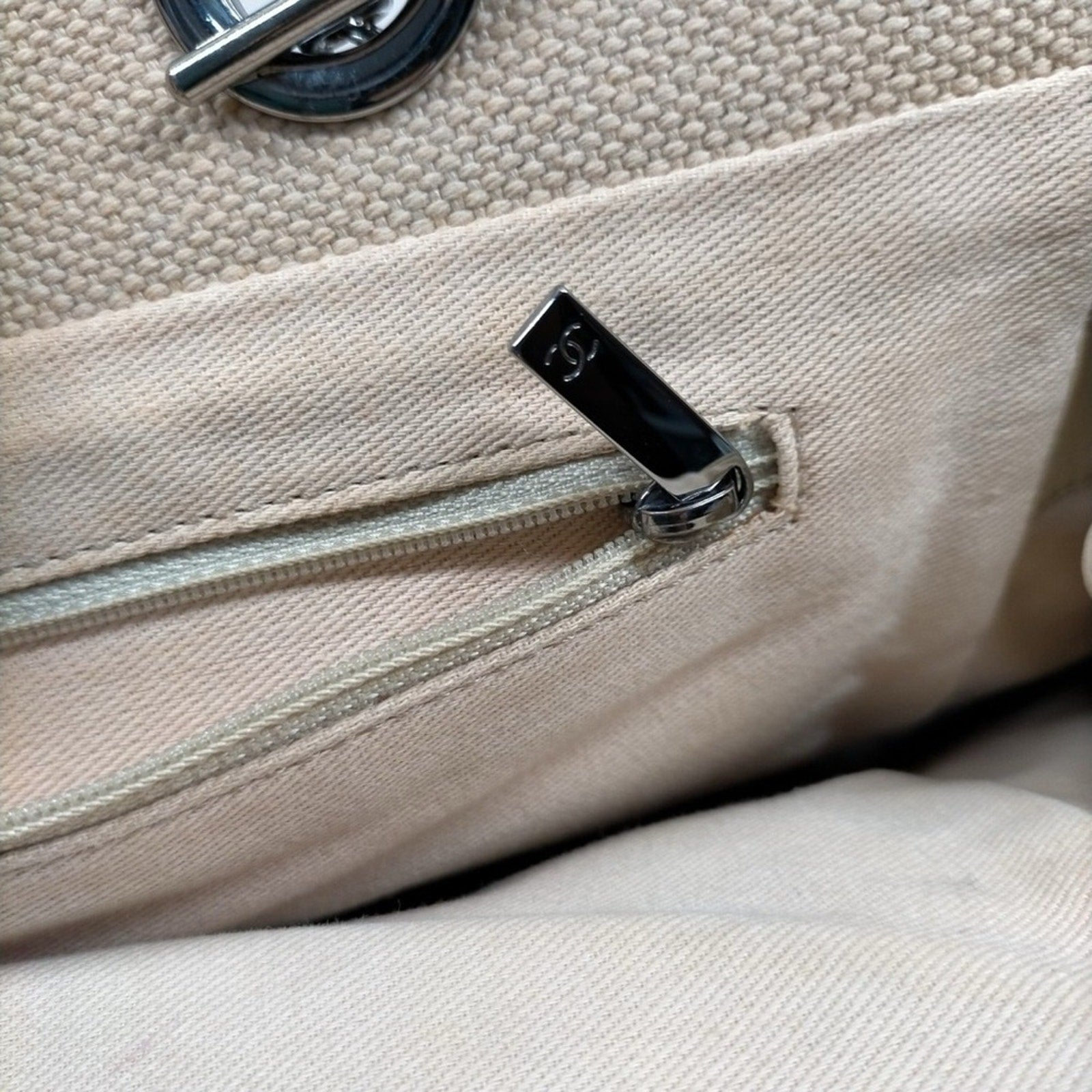 • Beige canvas body with embossed CC logo