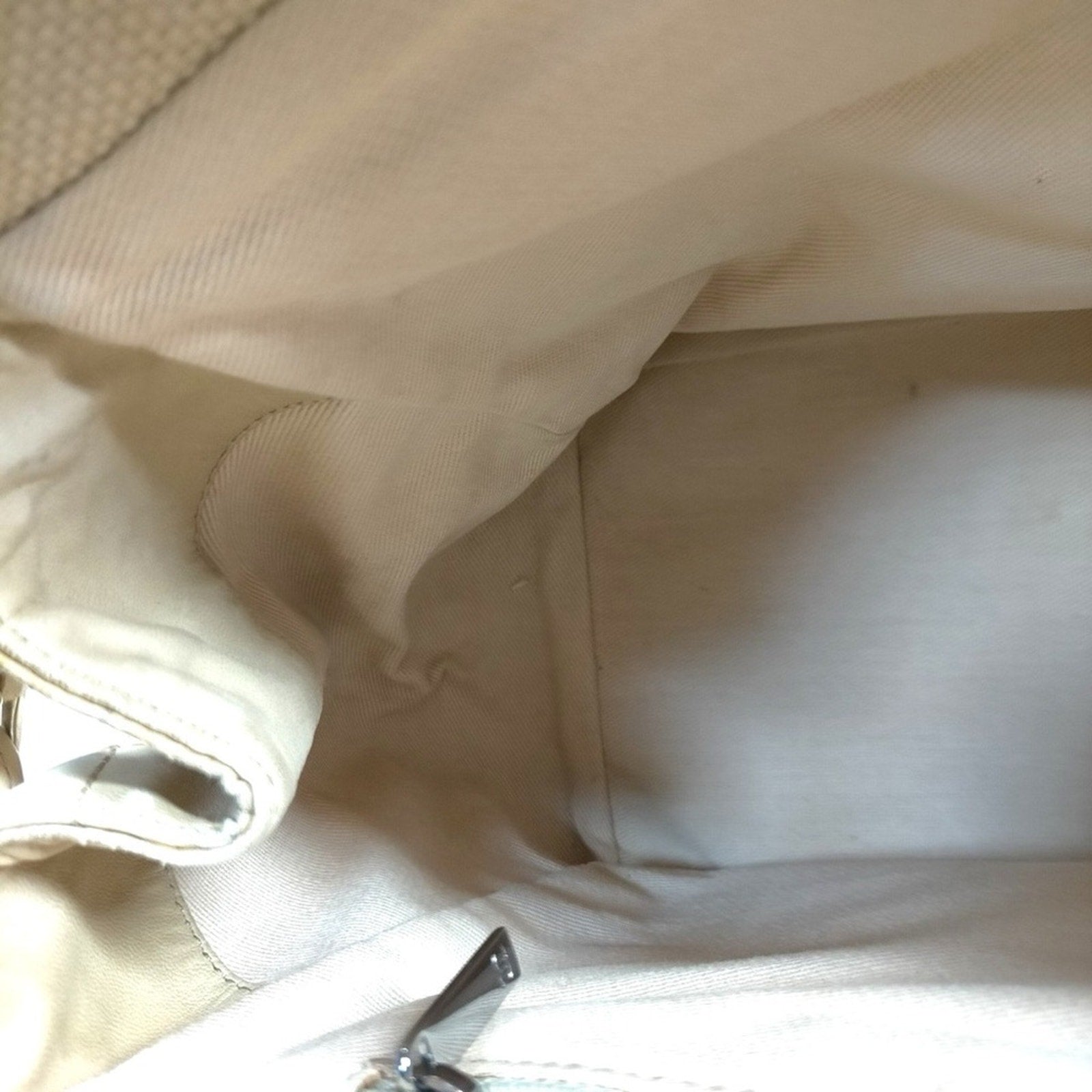 Pre-owned vintage condition. Canvas shows visible wear and discoloration in areas, netting has signs of wear, and leather corners show scuffing consistent with age and use. Interior is clean. Hardware is intact.