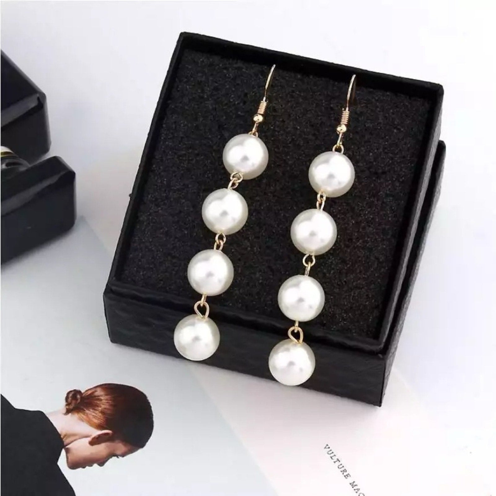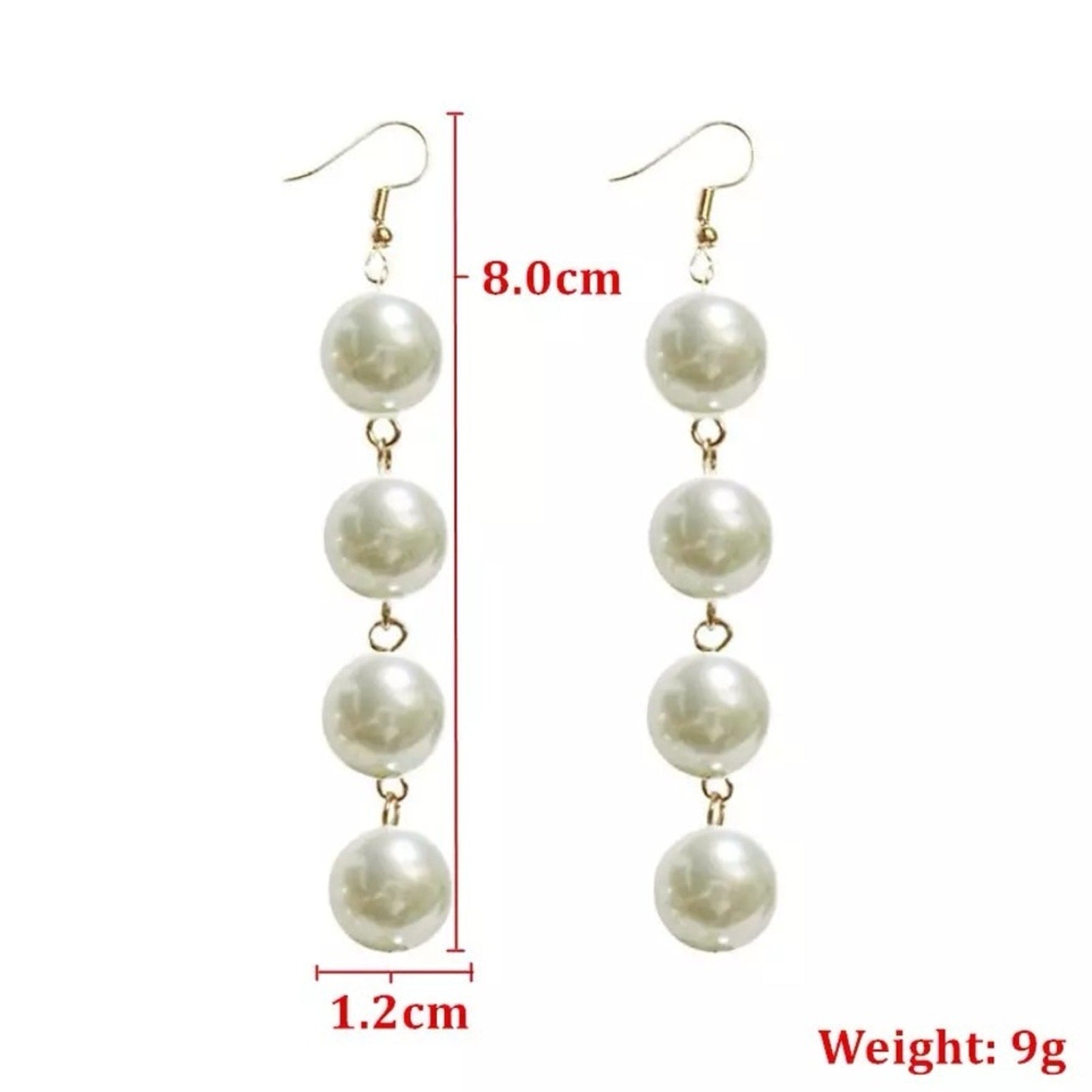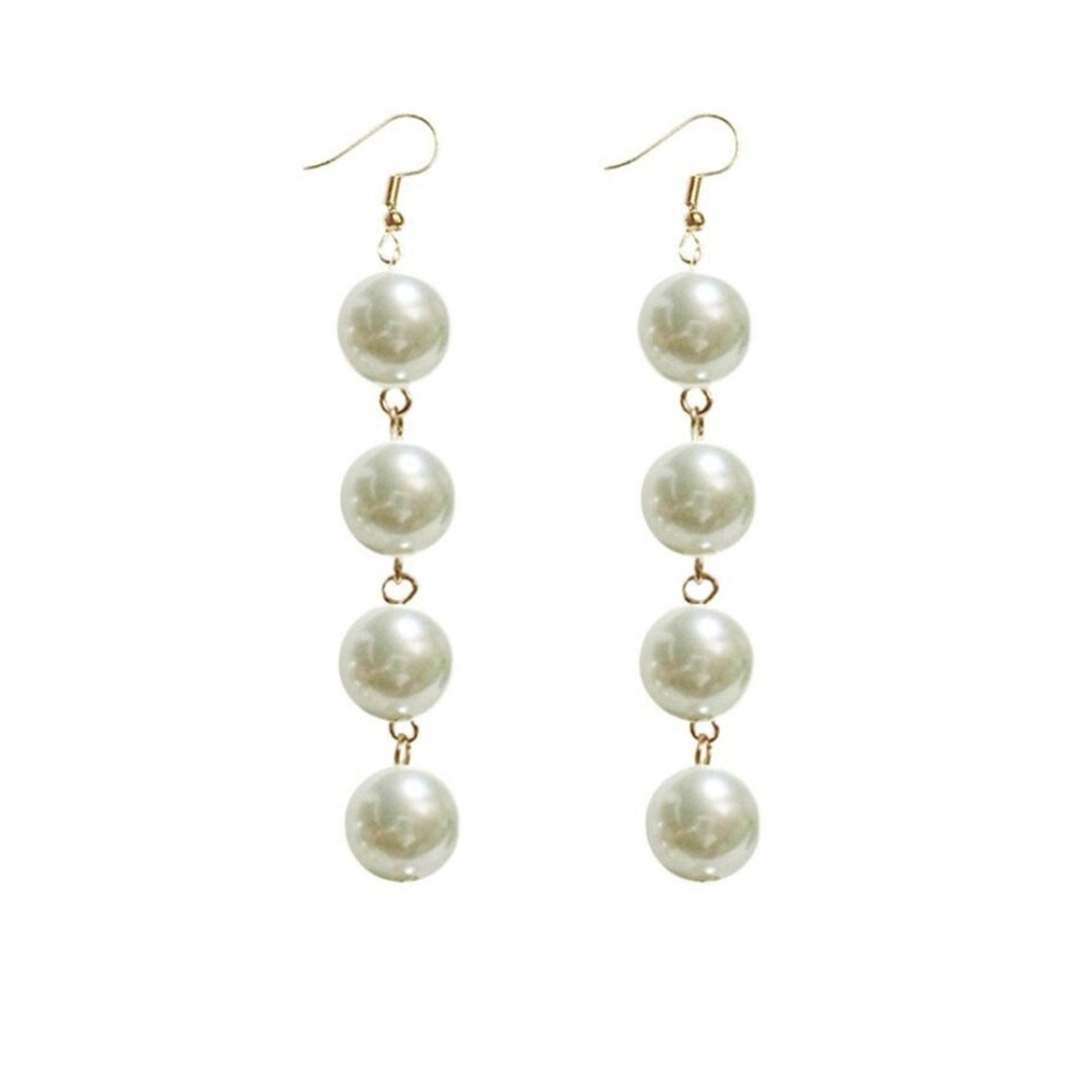 Add a graceful touch to your look with these timeless pearl dangle earrings. Featuring 4 glossy pearls linked together on a gold-tone stainless steel hook, these earrings are light yet striking – perfect for elevating any outfit, from casual to classy.