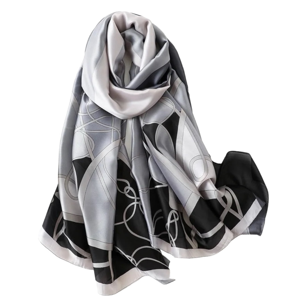 Wrap yourself in the monochromatic melody of our “Serenade of Swirls” Silk-Emulation Scarf. Crafted with a keen eye for elegance, this scarf features a dance of abstract swirls across a canvas of luxurious silk-like polyester, creating a harmonious blend of classic black, white, and shades of gray.
