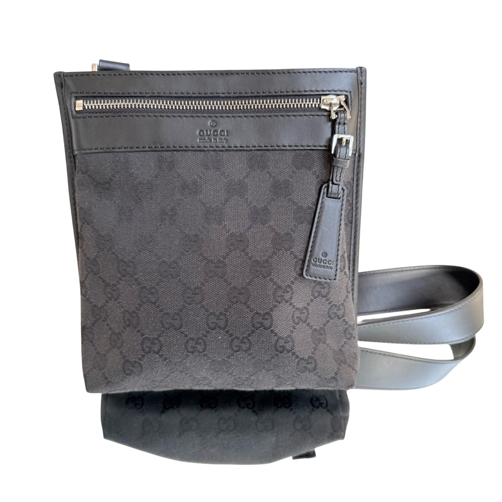 A sleek and timeless Gucci GG Canvas crossbody crafted in rich black canvas with smooth leather trim and silver-tone hardware. This unisex design is perfect for travel, errands, and everyday wear — lightweight, stylish, and built to last.
