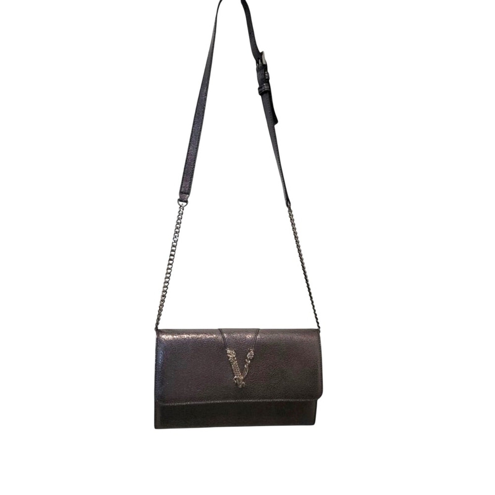 Elevate your collection with this authentic Versace Virtus Metallic Calfskin Shoulder Bag, crafted in a stunning dark silver-grey tone with a luxe shimmer finish.